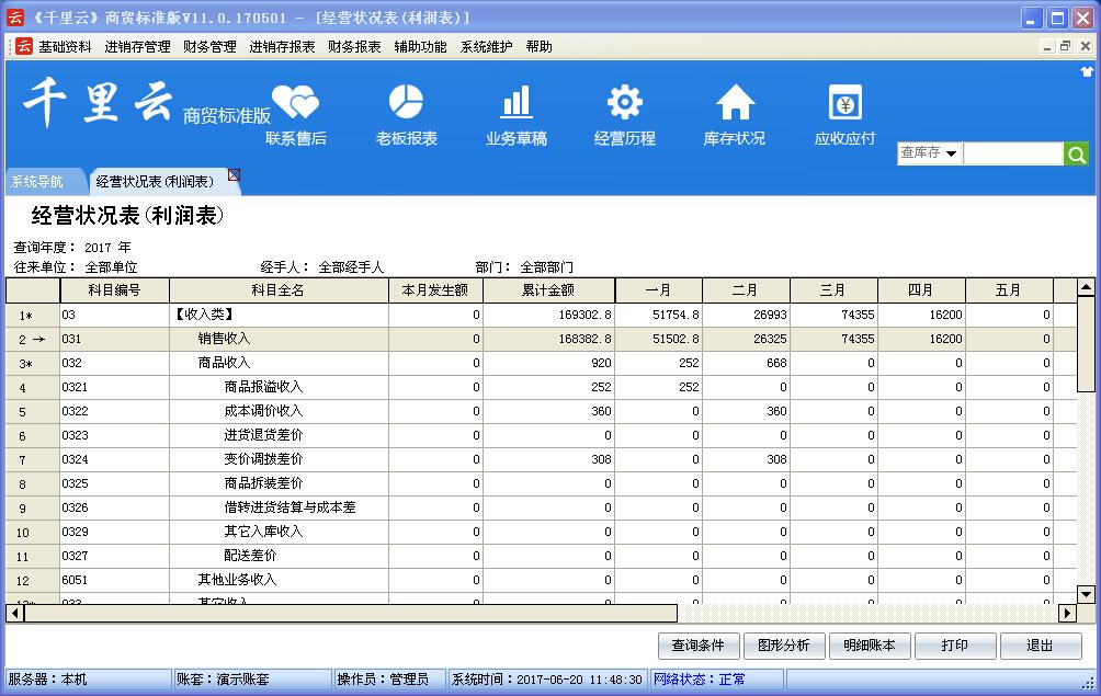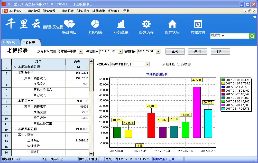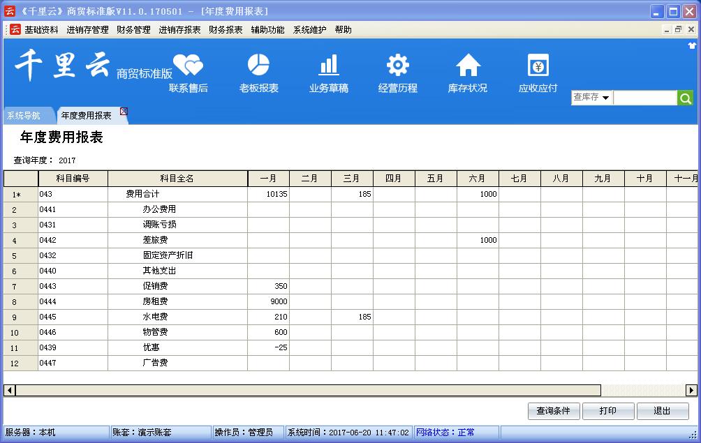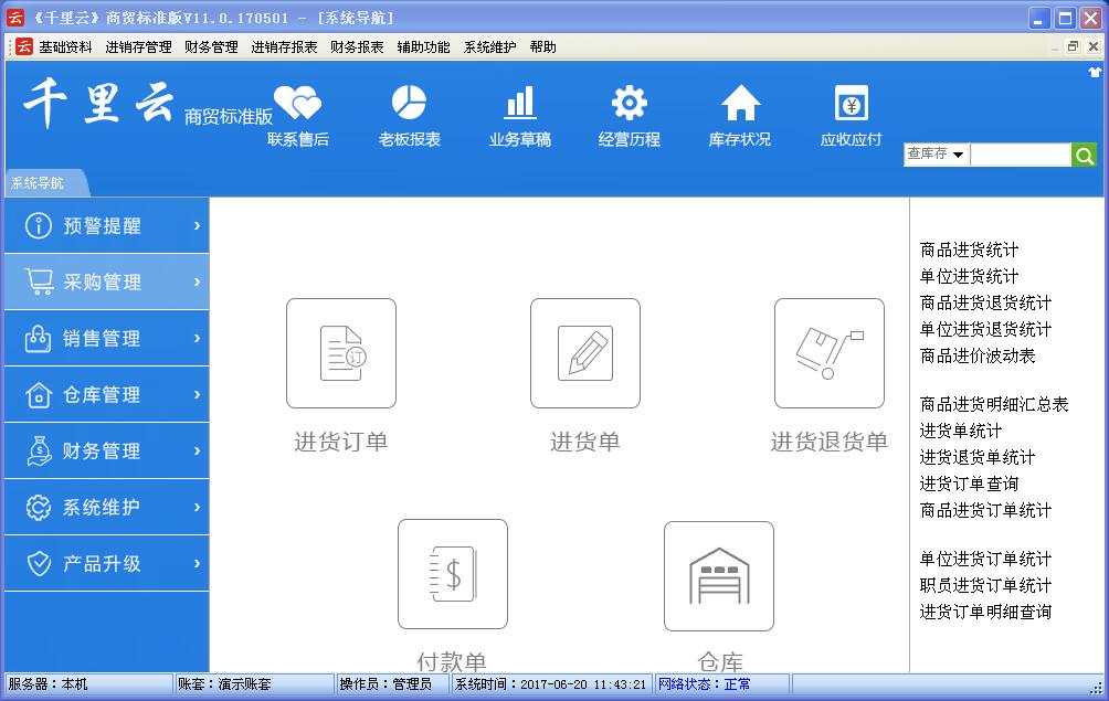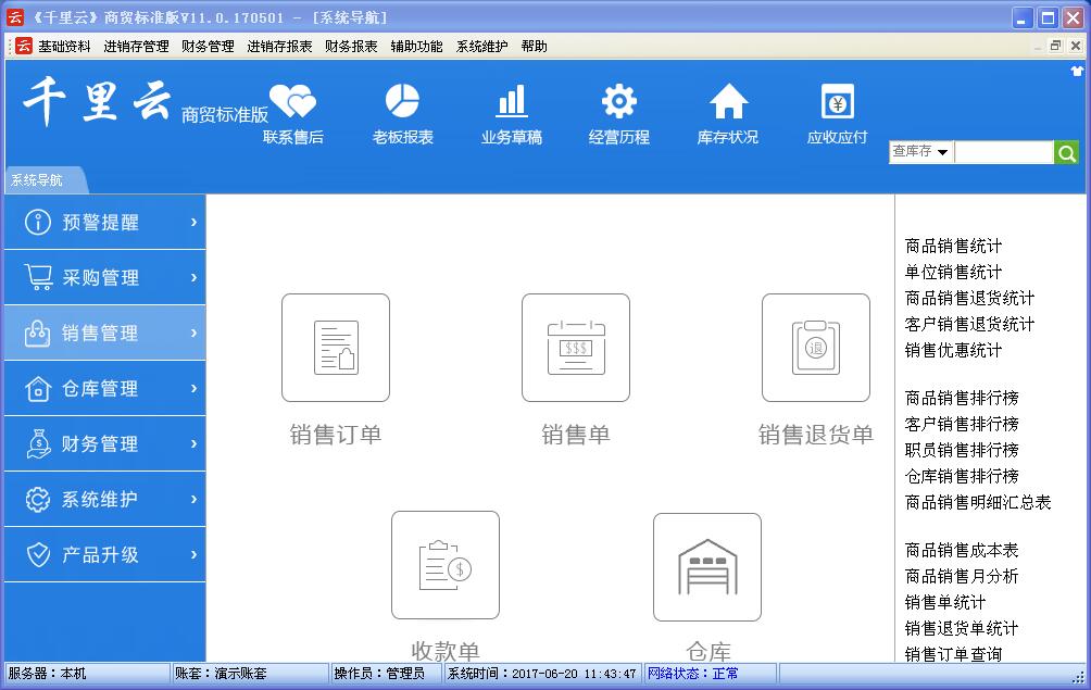 千里云软件是以“实用、管用、好用”为核心理念设计,管理采购、销售、库存及财务账目。使用者只需录入企业每天发生的各种业务单据,系统会自动分类,汇总和统计自动生成进销存账,库存明细账,往来应收应付账,费用资金账,年报,月报,日报等各类报表,查询、统计和分析快捷方便。