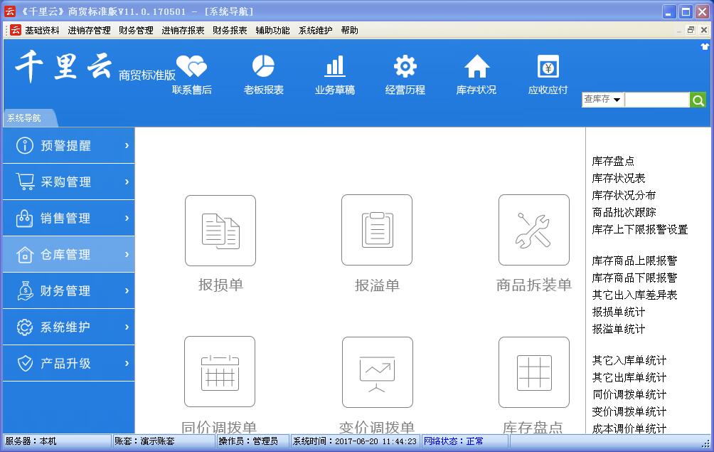 3、仓库管理:库存状况、报损处理、报溢处理、同价调拨、变价调拨、成本调价、商品的组装与拆分、库存盘点、其他出库、其他入库、借欠业务、库存上限下限报警处理、生产模版、效期及保质期管理、批次跟踪;(统计报表:库存盘点、库存状况表、库存上下限报警、其他出入库差异表、报损单统计、报溢单统计、其它入库单统计、其他出库单统计、同价调拨单统计、变价调拨单统计、成本调价单统计、商品拆装单统计等等)