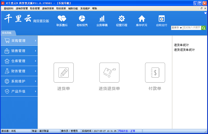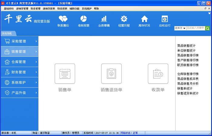 千里云软件是以“实用、管用、好”为核心理念设计,管理采购、销售、库存及财务账目。使用者只需录入企业每天发生的各种业务单据,系统会自动分类,汇总和统计自动生成进销存账,库存明细账,往来应收应付账,费用资金账,年报,月报,日报等各类报表,查询、统计和分析快捷方便。