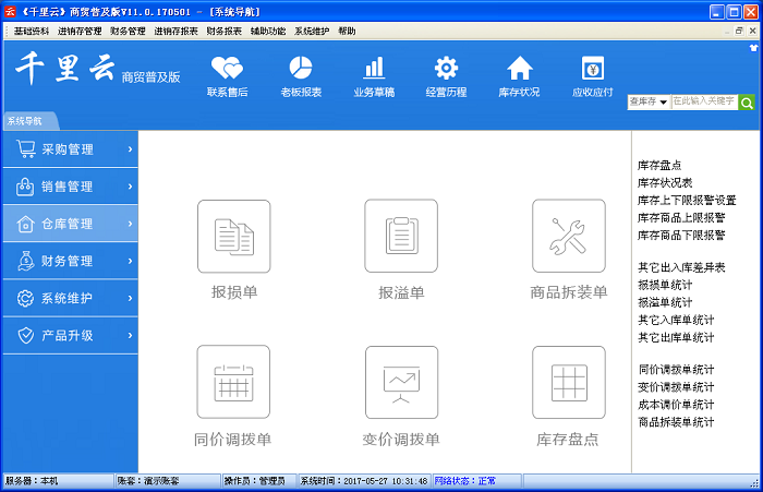 3、仓库管理:库存状况、报损处理、报溢处理、同价调拨、变价调拨、成本调价、商品的组装与拆分、库存盘点、其他出库、其他入库、借欠业务、库存上限下限报警处理;(统计报表:库存盘点、库存状况表、库存上下限报警、其他出入库差异表、报损单统计、报溢单统计、其它入库单统计、其他出库单统计、同价调拨单统计、变价调拨单统计、成本调价单统计、商品拆装单统计)