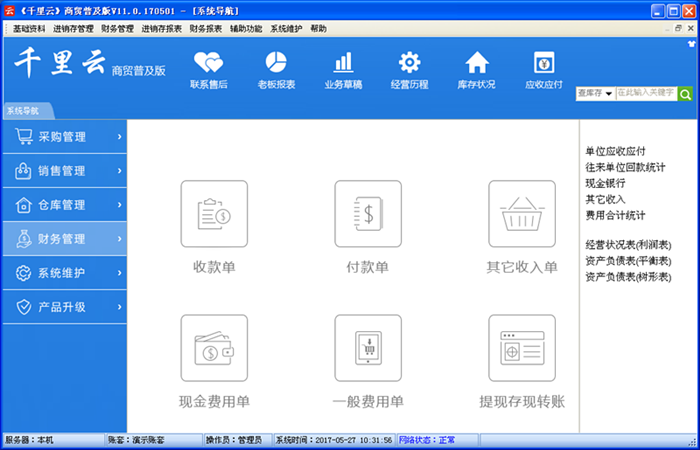 4、财务管理:收款单、付款单、现金费用单、一般费用单、其他收入单、提现存现转账、资金增加与减少、应收款增加与减少、应付款增加与减少;(统计报表:老板报表、单位应收应付、往来单位回款统计、现金银行、其他收入、费用合计统计、经营状况表(利润表)、经营状况表(平衡表)、资产负债表(树形表))