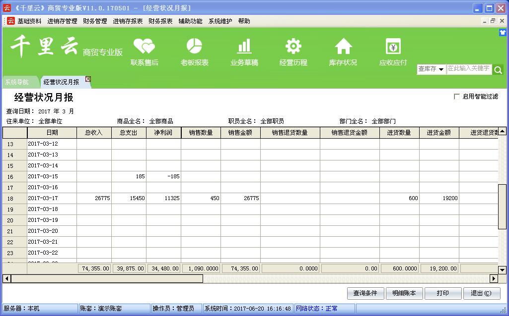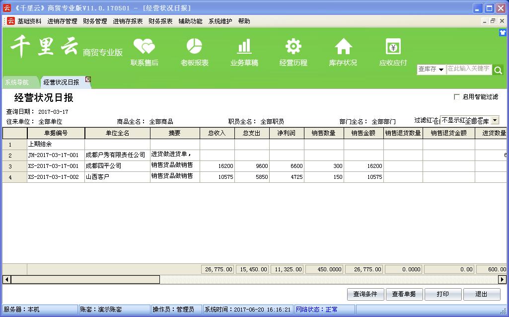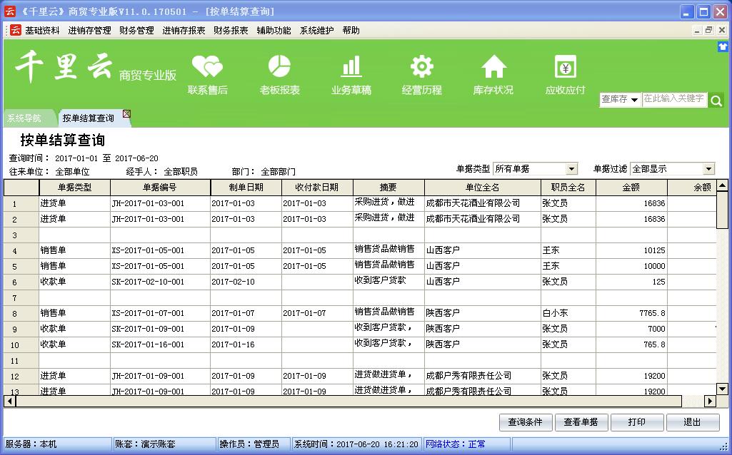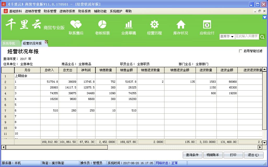 千里云软件是以“实用、管用、好”为核心理念设计,管理采购、销售、库存及财务账目。使用者只需录入企业每天发生的各种业务单据,系统会自动分类,汇总和统计自动生成进销存账,库存明细账,往来应收应付账,费用资金账,年报,月报,日报等各类报表,查询、统计和分析快捷方便。