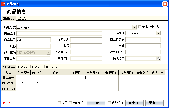 成本算法:系统提供四种成本核算方法,移动加权平均法、先进先出法、后进先出法和手工指定法,选用哪种成本算法可根据企业自身特性。 先进先出法将按照先入库的成本计算销售成本,后进先出法将按照后入库的成本计算销售成本,手工指定法将按照你指定出库的批次进行计算销售成本,手工指定法可以管理生产日期和批号。 有效期(天):有效期主要用于商品的保质期管理,主要用于采用手工指定法的商品。查询时,在“库存查询-->商品保质期查询”中可以查询将要到保质期的商品。在“辅助功能-->启动报警”中,也可以查询到已到保质期的库存商品。 库存上限:当库存总量达到库存上限时软件会自动报警。 库存下限:当库存总量低于库存下限时软件会自动报警。 提成方案:用于对职员的提成管理,可设置按销售比例提成,也可以设置按销售总额进行提成。只有专业版才有此功能 基本单位:商品的最小单位,如一件有十个,就可以在基本单位录入个,辅助单位1录入件,辅助单位1的单位关系录入10,在进货和销售的时候可以选择个或者件,库存状况表也会换算还有多少件多少个。